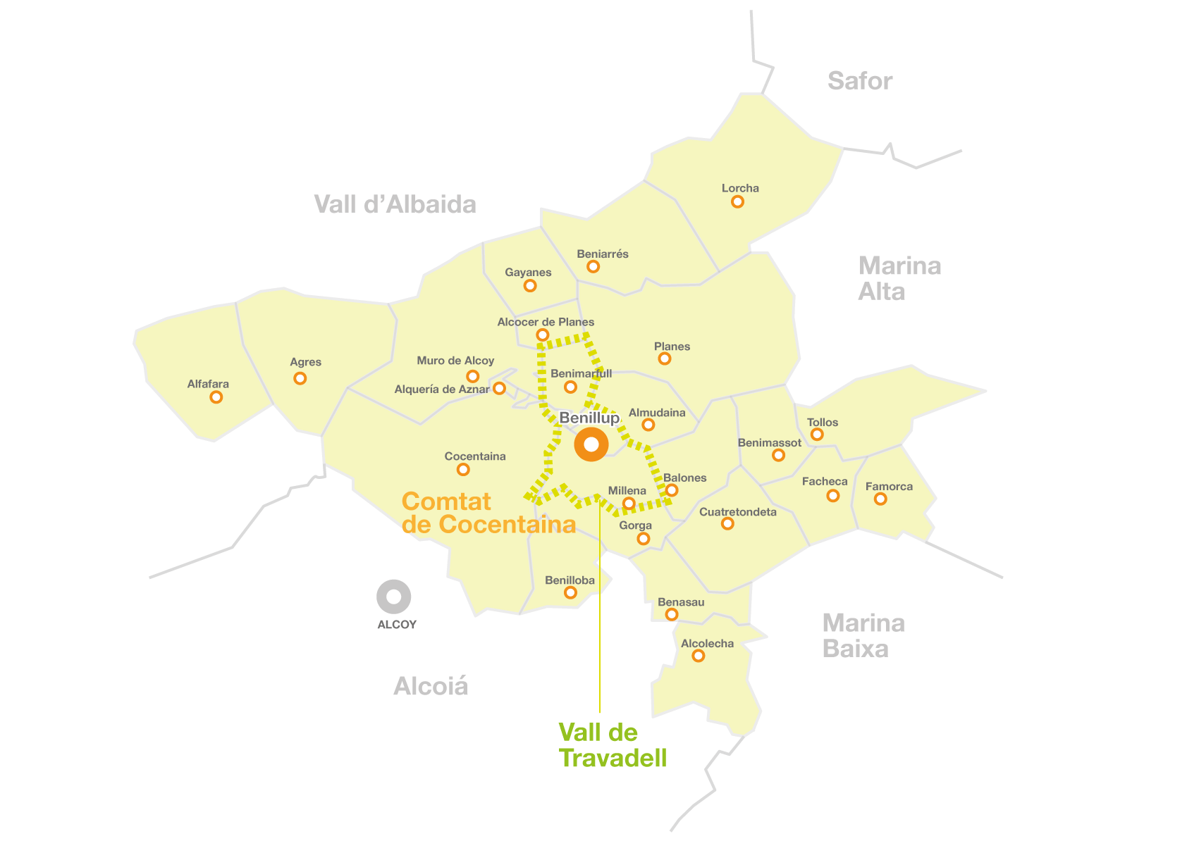 La Vall de Travadell ( FALTA INGLES )está compuesta por los municipios de Benimarfull, Benillup y Millena, aunque lo cierto es que geográficamente, este último debería quizás pertenecer a la Vall de Seta, al situarse en la cara sur de la Serra d’Almudaina, cerca de otros pueblos como Balones o Benimassot.